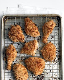 3. Working with one piece at a time, lift chicken from buttermilk mixture (letting excess drip off) and dredge in breadcrumbs, pressing firmly to adhere. Transfer chicken to rack.