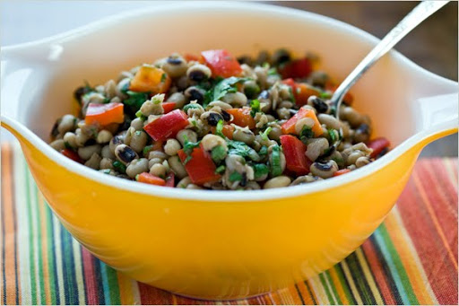 1. Heat 1 tablespoon olive oil in a large, heavy soup pot over medium heat and add the onion. Cook, stirring, until tender, about 5 minutes. Add half the garlic and cook, stirring, until the garlic is fragrant, 30 seconds to a minute. Add the black-eyed peas and the water and bring to a simmer. Skim off any foam from the surface of the water. Add the bay leaf and salt to taste (1 to 2 teaspoons). Reduce the heat, cover and simmer 30 minutes. Taste and add more salt if desired. Add the remaining garlic, cover and simmer until the beans are tender but intact. Taste and adjust salt. Remove from the heat and carefully drain through a colander or strainer set over a bowl. Transfer the beans to a large salad bowl.