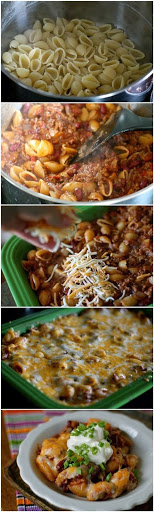 6.Pour the chili pasta mixture into a 9×13 pan. Flatten out with a spatula and sprinkle with cheese. Place in the oven for 30 minutes or until the edges are bubbling and the cheese has fully melted.