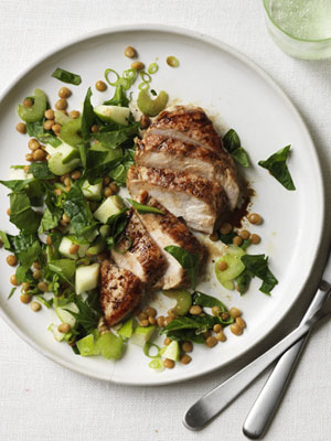 Meanwhile, in a large bowl, toss the scallions, apple, celery, lemon juice, remaining 2 Tbsp oil, ½ tsp salt and ¼ tsp pepper. Fold in the lentils, spinach and parsley (if using). Serve with the chicken.