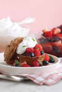 4. In a large bowl, combine all berries, liqueur, and remaining 2 tablespoons granulated sugar. Let stand for 15 minutes. Halve cakes horizontally. Spoon berry mixture over each cake bottom, and top with whipped cream. Cover with cake tops. Garnish with fresh mint, if desired.