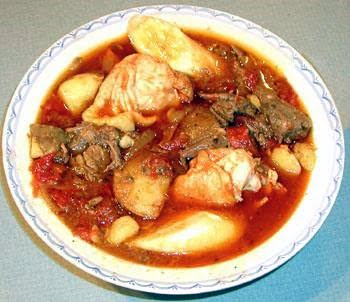 4. About 45 minutes later, heat 1/4 cup olive oil in a skillet over medium heat. Sauté the onion and green pepper until the onion is translucent.Add the garlic, paprika, salt, pepper, cumin, and tomatoes, and cook for about 5 minutes.Add this vegetable mixture and the bay leaf to the meat and the broth. Let simmer for 15 minutes while you peel and cut the vegetables.