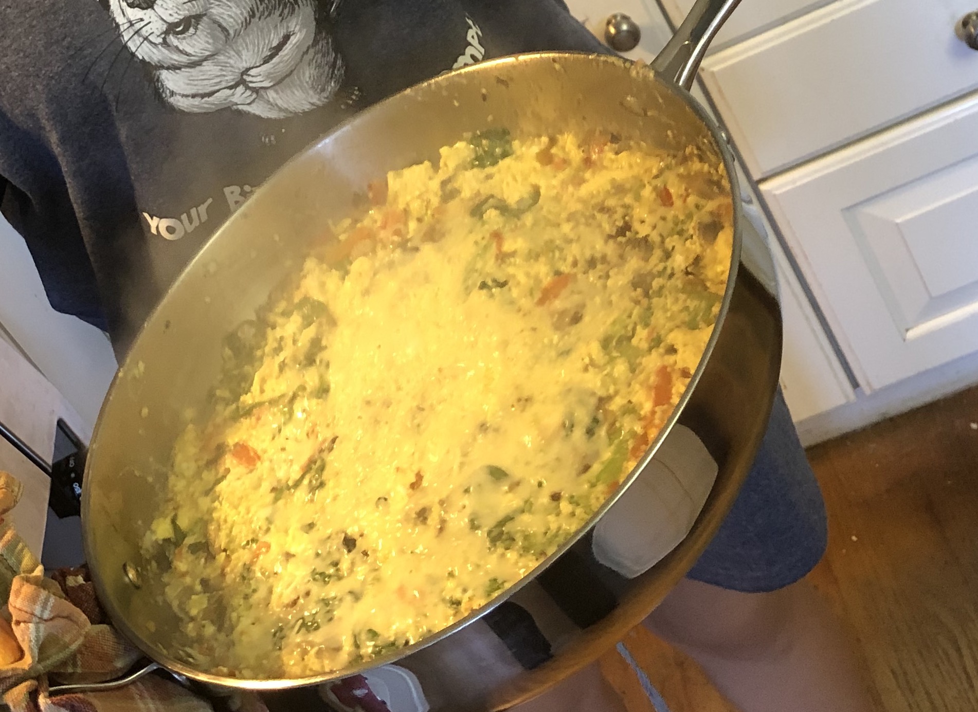 5. Lower heat to low. Add egg mixture to sauteed vegetables.
