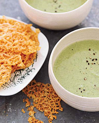 1.Preheat the oven to 350°. Line a baking sheet with parchment paper. Sprinkle the cheese on the sheet in eight 2-inch rounds. Bake for 18 minutes, until darkened slightly. Blot the crisps with paper towels and let cool (they'll harden as they cool).