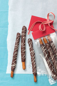 Working over saucepan, spoon caramel over pretzels, letting excess drip off. Place pretzels on prepared baking sheet, and freeze for 15 minutes or until caramel is firm.