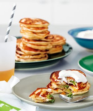 5. Cook the pancakes as you normally would (use olive oil instead of butter to help kick it up to dinner status). You can experiment with the amount of vegetables you include in each scoop of batter, depending on your kids’ tolerance levels. Top with the sour cream and serve.