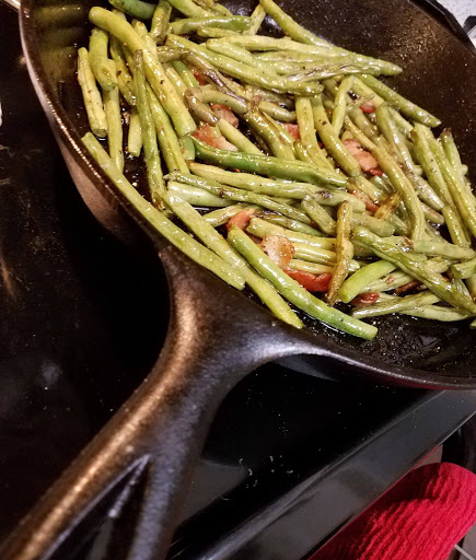 Chop bacon into small pieces. I'd say maybe 2 slices of bacon per pound of green beans! ((I need to check this, you know I'm bad at guesstimating!))