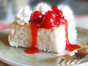 Once cooled, cut with a serrated knife and serve with your choice of topping. Some ideas include fruit, fruit and fruit sauce, gluten free pie filling, whipped cream, custard, mousse, etc.