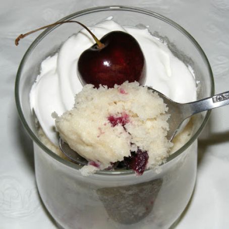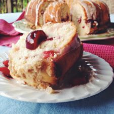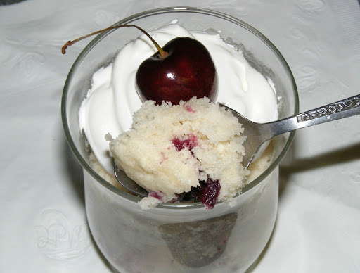 Cool to lukewarm on a rack then top with whole cherries and whipped cream and serve.
