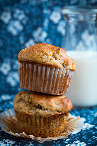 Working in three separate batches, beginning and ending with flour mixture, add 1/3 of the flour mixture alternating with 1/2 of the mashed bananas and mixing until well blended after each addition. Divide batter among 12 paper lined muffin cups, filling each to the top (about 1/3 cup in each), then bake in preheated oven 17 to 20 minutes, until toothpick inserted into center comes out clean (or with a few moist crumbs. If you feel they are browning too much near the end you can tent the tops with a sheet of foil).