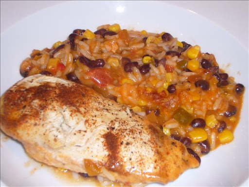 This recipe is rated 5 stars by all 3 of us! I did add the remaining salsa in the jar (about 1/4 cup), and I added black beans to it as someone else suggested (since I'm a vegetarian). Other than those minor additions, I followed the recipe exactly. It was a wonderful one-dish meal. Hubby and son said the chicken was juicy, tender and very flavorful, and they loved the rice too. We all agreed that the rice had a wonderful flavor and texture (wasn't soggy or gloppy). Its nice to be able to please the carnivores and the vegetarian without having to cook 2 separate meals! I also made a tossed mixed-green salad to go with it. This recipe was so easy to prepare, I've added it to my repertoire of chicken dishes :)