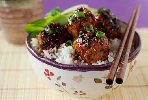 While the sauce is thickening, combine the second group of ingredients (reserving one tablespoon of the green onion tops) in a medium bowl. Shape into 2-inch meatballs.