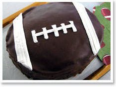 A football cake with mud filling (marshmallow cream, crushed chocolate cookies, caramel and butter) is the perfect end to a football or Super Bowl party.