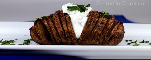 When the potatoes are done baking, allow them to cool for a few minutes before topping each with a dollop of garlic herb sour cream.