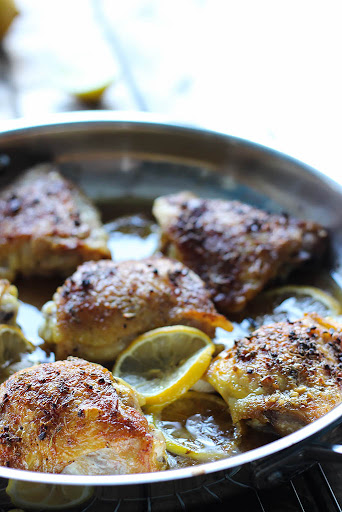 In an oven-safe skillet over medium high heat, sear the thighs on both sides until golden brown, about 5 minutes each side. Drain any excess oil and arrange chicken thighs skin side up
