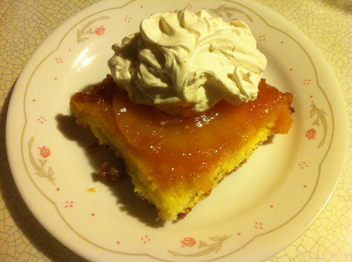 Beat egg whites until stiff. Set aside. Beat egg yolks until thick. Add sugar. Sift flour and baking powder together. Add alternately with pineapple juice to egg yolk mixture. Gently fold in egg whites. Pour over pineapple slices. Bake at 350 degrees for 45 minutes. Turn upside down. Cool. Serve with whipped cream.