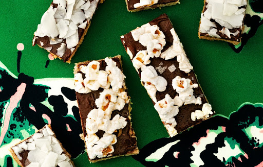 Scatter toppings over warm chocolate; lightly but firmly press into chocolate. Sprinkle with salt. Let cool in dish on a wire rack for 15 minutes. Using foil overhang, lift cookie from dish. Place on rack; let cool until chocolate is set, about 2 hours.