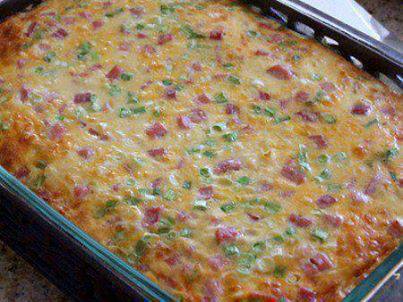 Arrange hash browns evenly in the bottom of the dish. Sprinkle with cheese, ham, and green onion. In a large mixing bowl, combine eggs, milk, salt and pepper. Pour egg mixture over potato mixture in dish.