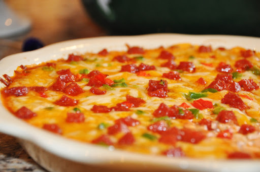 2. Spread in the bottom of a 9 inch pie plate. (I used a round cake pan). Combine cheeses and sprinkle half over the cream cheese layer.