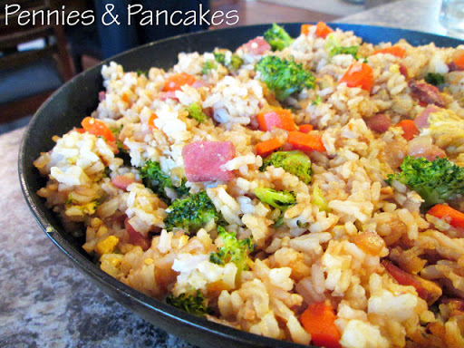 (Note: This fried rice is a little stickier than restaurant-style fried rice because I use less oil for frying, and an over-abundance of vegetables. If you're not a fan of sticky rice, be sure to use pre-cooked cold rice to combat the stickiness. If you don't have any rice sitting in the refrigerator, you can make fresh rice. It'll just be stickier. This recipe is versatile. Different vegetables or varieties of rice, or meat may be substituted: brown rice, basmati rice, jasmine rice, corn, peas, mushrooms, peppers, chicken, shrimp, beef etc. Really, whatever you have in your fridge that needs to be used up.)