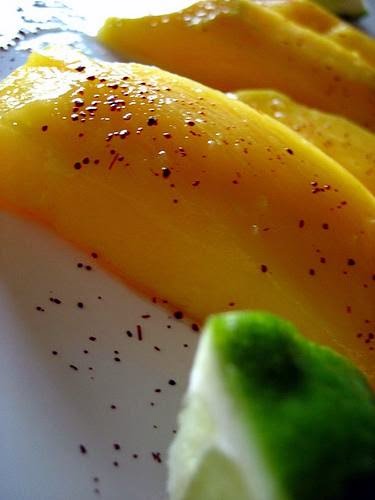 Slice mangos and arrange on plate. Squeeze lime juice over evenly. Sprinkle with chili powder and course salt.