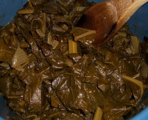 put in the chopped onion, salt, garlic, and a little broth or oil. After about 10 minutes, stuff the collards into the crock pot,