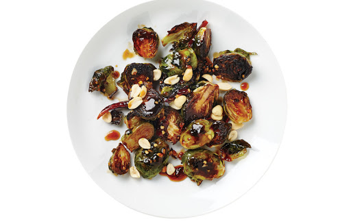 Toss brussels sprouts with sauce and serve topped with peanuts.