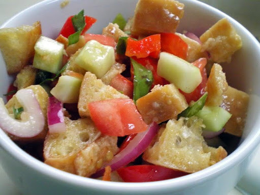 In a large bowl, mix the tomatoes, cucumber, red pepper, yellow pepper, red onion, basil, and capers. Add the bread cubes and toss with the vinaigrette. Season liberally with salt and pepper. Serve, or allow the salad to sit for about half an hour for the flavors to blend.