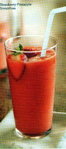 1. In a blender, combine strawberries, pineapple, mango, and pineapple juice. Cover and blend until smooth. With blender running, gradually add ice cubes through opening in lid. Blend until smooth after each addition. Serve immediately in chilled glasses. If desired, garnish each serving with fresh strawberries or mango chunks.