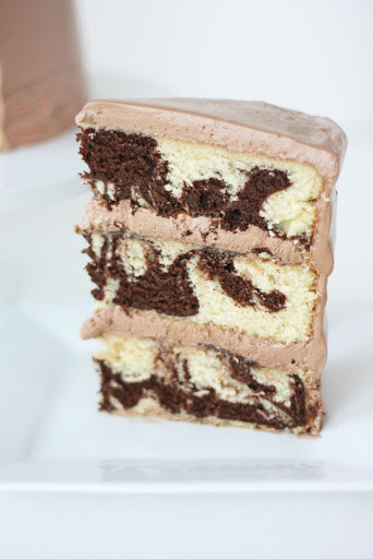 Spread a thin layer of the vanilla batter that was set aside in the bottom of the cake pans (use about 2/3 of the vanilla batter). Top each vanilla batter with one third of the chocolate batter. Distribute the remaining vanilla batter evenly into the three pans and swirl the batters together with a butter knife taking care not to overmix the two.