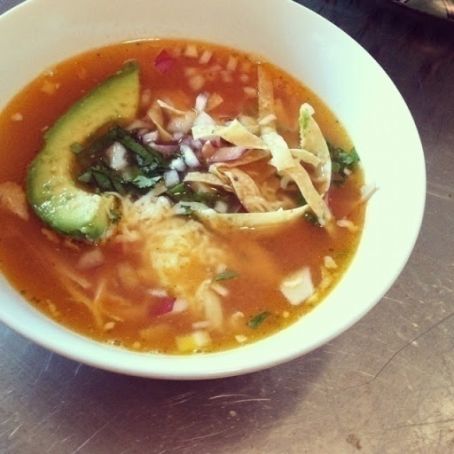 Put crunched tortilla chips in a bowl with cheese and avocados. Ladle soup over; top with cilantro and red onions. Serve with Spanish rice on the side.