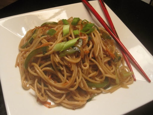 1 ***NOTE:I like to buy the coleslaw mix in the produce section. 2 Already shredded--a real time saver. 3 ***NOTE:If I'm in a hurry, I also buy the carrots already shredded in the produce section, and use instead of sliced. 4 Heat 2 tbsp olive oil in a large skillet or wok. 5 Sauté pork, onion, garlic and pepper flakes until meat is no longer pink. 6 Remove this mixture from pan and keep warm. 7 Add remaining tbsp of oil (or more as needed) to pan and sauté cabbage, bok choy or celery, carrots and peppers until crisp tender. 8 Add spaghetti to cooked veggies in the pan. 9 Stir in soy sauce and add pork mixture back to the pan. 10 Cook for 5 minutes or until heated through. 11 (At this step, I like to get the noodles nice and dark, by cooking a bit longer. You decide).