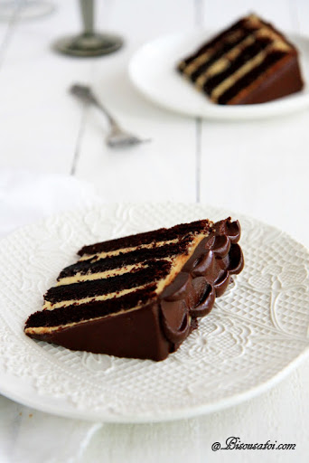 I did not use her chocolate peanut butter glazing recipe but instead used my typical ganache recipe and piped petal effect all around my cake..