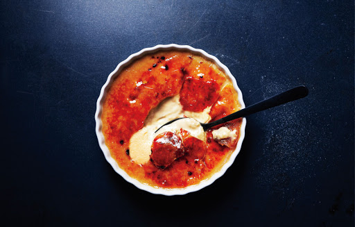 Just before serving, sprinkle custards evenly with sugar and heat with torch until sugar is melted and caramelized to a deep amber color. Your goal is to make a thin, smooth, brittle crust that shatters when broken.