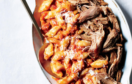 Working in 4 batches, cook gnocchi in a large pot of boiling salted water until they float, about 3 minutes. Using a slotted spoon, transfer to a pan of tomato sauce as you go. Sprinkle with Parmesan and serve with pork shoulder