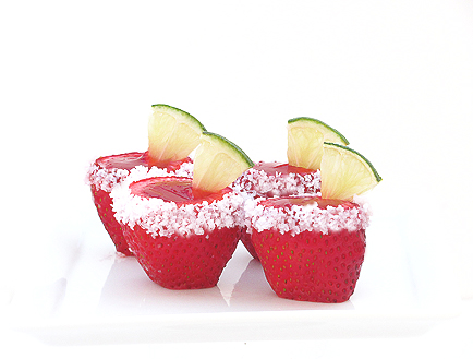 Pour final Jell-o mix into strawberries and chill overnight. Dip your finger in water or use a moistened brush to wet the edge of the strawberries, dip and rotate the strawberries in salt to rim. Garnish with cut lime triangles to finish