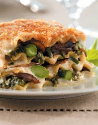 Top with 4 sheets of lasagne, asparagus and eggplant as above, and 3 tablespoons of pesto sauce. Repeat these 2 layers for a total of 4 layers.
