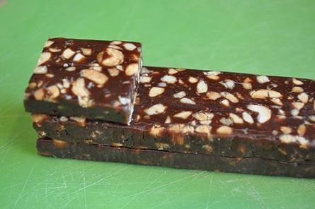 Melt syrup & chocolate over low heat in a non-stick sauce-pan. Remove from heat. Add peanut butter & mix until melted. Add oatmeal & peanuts. Mix well. Pour evenly into a buttered cookie sheet. Let set in fridge for 30 minutes.