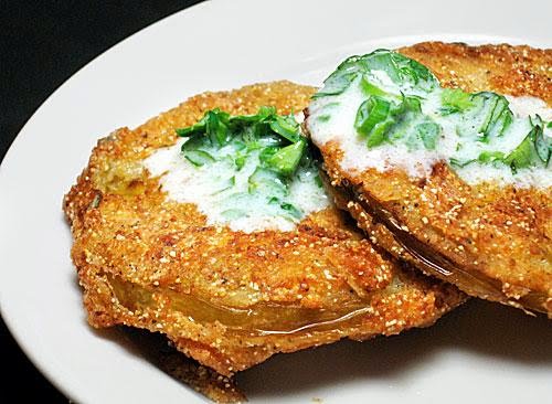 Spray foil with pam and put on baking sheet. In shallow dish combine cormeal, breadcrumbs and creole seasoning. In another shallow dish beat egg white. Dip tomato in egg then dredge in cornmeal. Place on baking sheet. Spray each one with pam. Bake at 350 degrees for 15-20 minutes or until lightly browned. Garnish with parsley.