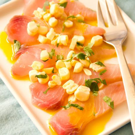 Make the tiradito sauce: In medium bowl whisk together aji paste, lime juice, lemon juice, orange juice, and oil. Drop in ginger slices and smashed garlic clove; set aside in the refrigerator to chill for 20 minutes, then remove and discard ginger slices and garlic clove. The sauce may be made up to 3 days ahead of time to this point. Store covered and refrigerated.