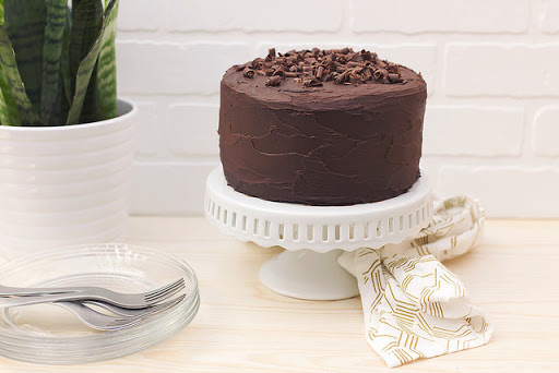 5. Place the first cake onto a cake plate or stand, top with a little less than half of the Dark Chocolate Ganache Frosting, recipe below, (after it has cooled and is thickened up), spread into an even layer and place the first layer into the fridge to firm up, about 30 minutes or so. Top with the second cake and frost with the remaining frosting, spread evenly across the top and sides of the cake, sprinkle with a little shaved chocolate, if you’d like. Serve immediately or store covered in the fridge for up to 1 week.
