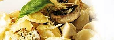 1 (10-oz.) container Buitoni Light Alfredo Sauce,1 1/2 cups thinly sliced crimini mushrooms,3 tbsp. Marsala wine,1 cup rotisserie chicken chunks,4 oz. Colavita Orchiette Pasta,1/4 cup shredded Parmesan cheese,Snipped fresh basil
