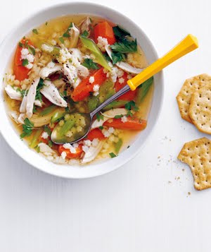 4. Meanwhile, shred the chicken, discarding the bones. When the pasta is cooked, stir the chicken into the soup along with the parsley. Serve with the crackers, if desired.