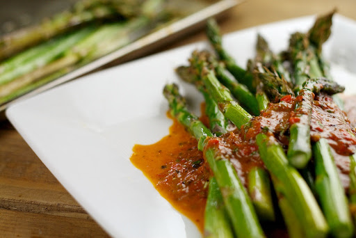 1 Coarsely chop red peppers. 2 Cook peppers and garlic in oil over low heat 30 minutes. 3 Puree mixture in food processor or blender. 4 Add vinegar, basil, salt and pepper. 5 Bring water to boil in skillet, add asparagus spears. 6 Return water to boiling and simmer, covered about 5 minutes or until asparagus is crisp-tender. 7 Drain. 8 Spoon red pepper sauce on platter and arrange asparagus on sauce. 9 Garnish with red pepper and basil, if desired. 10 Serve with baguette.