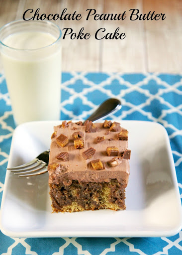 Chocolate and peanut butter is one of my favorite flavor combinations. I can not resist a Reese's cup or a Butterfinger. I also can not resist this cake! Peanut butter cake, drizzled with chocolate syrup, topped with Reese's and chocolate frosting. YUM!