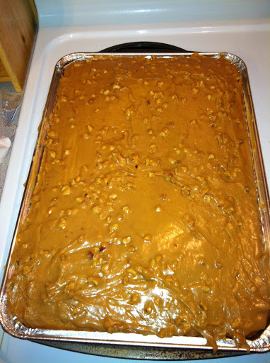 9. Spoon the frosting over the warm cake and spread in an even layer. Allow to cool before cutting and serving.