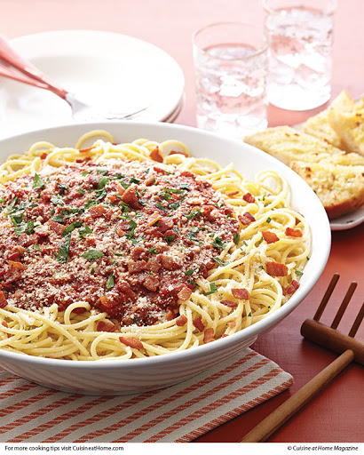 Remove sauce from heat and stir in ½ cup Romano, minced parsley, and bacon and serve over bucatini; garnish with additional Romano and chopped parsley.