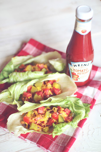 2. Stir in diced tomatoes, ketchup, mustard, and Worcestershire sauce. Reduce heat and simmer for a few minutes while you prepare the lettuce leaves.