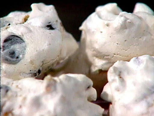 Working one teaspoon at a time, push a teaspoonful of meringue from the tip of 1 teaspoon with the back of another teaspoon onto the lined baking sheets, leaving 1-inch of space between cookies. Place baking sheets in the preheated oven and turn the oven off. Leave the cookies (undisturbed) in the oven overnight (or at least 7 hours), or until cookies are crisp and dry.