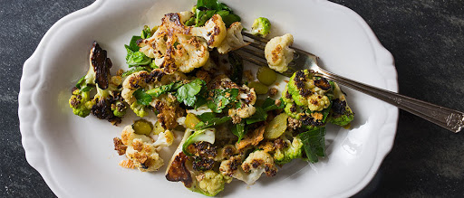 Jimmy Bannos Jr. of The Purple Pig in Chicago sears cauliflower with just a touch of olive oil to achieve a deep char and bring out the vegetable's nutty flavors. To finish the simple side dish, he tosses the cauliflower with lemon juice, parsley, briny cornichons and a handful of toasted bread crumbs.